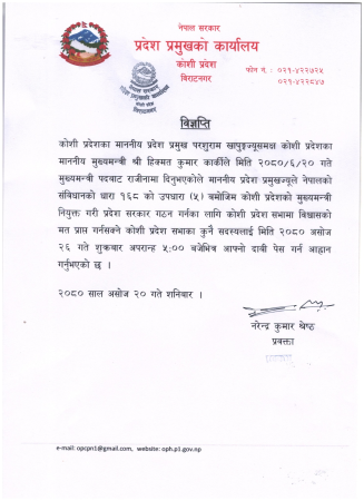 मुख्यमन्त्री हिक्मतकुमार कार्कीले आज दिउँसो प्रदेश प्रमुख परशुराम खापुङलाई राजीनामा बुझाएपछि प्रदेश प्रमुखले संविधानको धारा १६८ (५) बमोजिम प्रदेशसभाको विश्वासको मत प्राप्त गर्न सक्ने प्रदेशसभा सदस्यलाई मुख्यमन्त्री नियुक्त गरी सरकार गठनका लागि दाबी पेश गर्न आह्वान गर्नु भएको हो ।